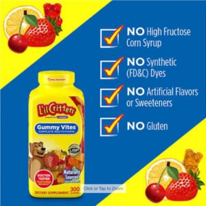 L’il Critters Gummy Vites Daily Multivitamin is a chewy kid’s multivitamin with 1 gummy providing essential nutrients like vitamins A, C, D, E, B6, B12, folate, biotin, zinc, iodine, lutein, and inositol.