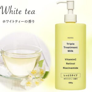 Olevea Triple Treatment Milk is a nourishing Japanese body lotion that deeply hydrates and smooths skin. Enriched with vitamins, retinol, niacinamide, and plant extracts, it helps brighten dull skin and improve elasticity. The lightweight milky texture absorbs easily without greasiness, leaving skin soft and refreshed. Suitable for dry or uneven skin needing daily moisture.